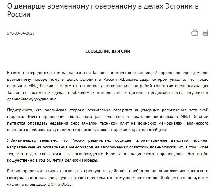 МИД провел демарш поверенному в делах Эстонии в России в связи с вандализмом на Таллинском военном кладбище.