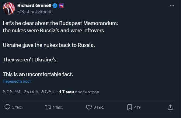 Спецпредставитель Трампа по особым поручениям Ричард Гренелл, вспомнив Будапештский меморандум ("Меморандум о гарантиях безопасности в связи с присоединением Украины к Договору о нераспространении ядерного оружия" от 5 декабря 1994 года), отметил "такой неудобный факт": ядерные заряды на территории Украины "не были украинскими", "это были остатки принадлежавших России ядерных зарядов".