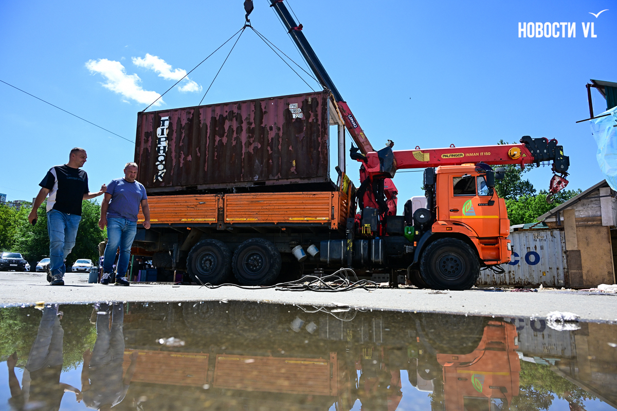 Ближе к двум часам дня, когда часть пожитков была собрана, на Спортивный рынок приехали эвакуаторы «СГТ». Там их дожидался фронтальный погрузчик, выполнявший сегодня роль бульдозера. Специалисты городской службы в два захода демонтировали четыре контейнера, где ещё недавно велась торговля, погрузили в кузова и отвезли на склад.