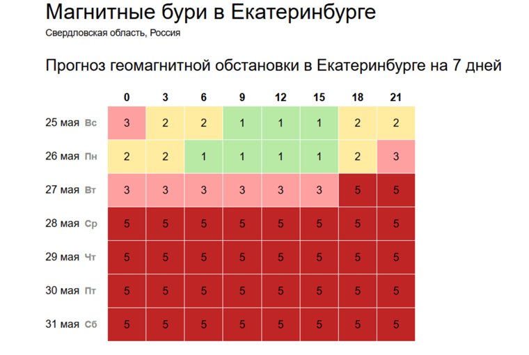 Первые признаки бури будут уже вечером в понедельник, 26 мая. Далее всю неделю жителей Екатеринбурга ждет геомагнитная активность пятого уровня. При этом показатели не будут опускаться все эти дни.