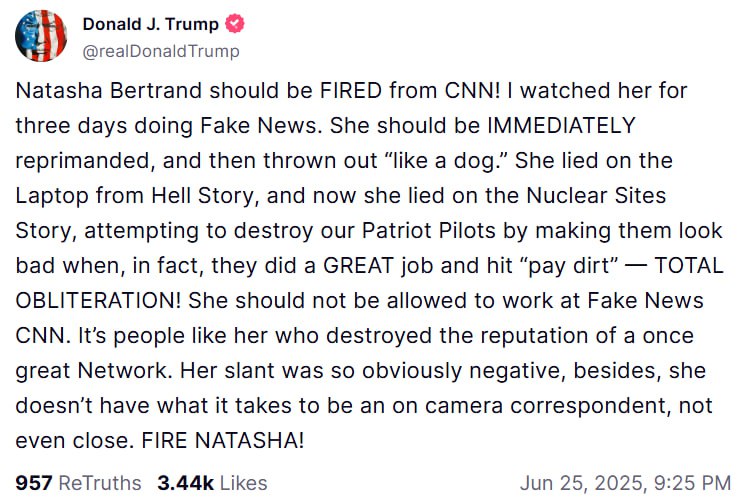 «Наташа Бертранд должна быть УВОЛЕНА из CNN! Я три дня наблюдал, как она занималась фейковыми новостями. Ее нужно НЕМЕДЛЕННО отчитать, а затем выгнать, как собаку. Она солгала в истории про «ноутбук из ада», а теперь она солгала в истории с ядерными объектами, пытаясь уничтожить наших патриотических пилотов, выставляя их в плохом свете, когда на самом деле они проделали ОТЛИЧНУЮ работу и достигли «золотого дна» — ПОЛНОЕ УНИЧТОЖЕНИЕ! Ей не должно быть позволено работать в фейковых новостях CNN. Именно такие люди, как она, разрушили репутацию некогда великой сети. Ее точка зрения была настолько явно негативной, к тому же у нее нет того, что нужно, чтобы быть корреспондентом перед камерой, даже близко. УВОЛЬТЕ НАТАШУ!»