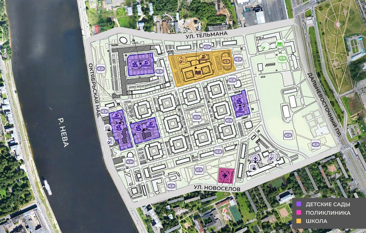Одновременно с домами будет строиться школа на 1525 мест, четыре детсада совокупно на 745 мест, поликлиника для взрослых и детей на 340 посещений в смену, а также скверы и спортивные площадки. Улицы Тельмана и новоселов застройщик расширит до нескольких полос.