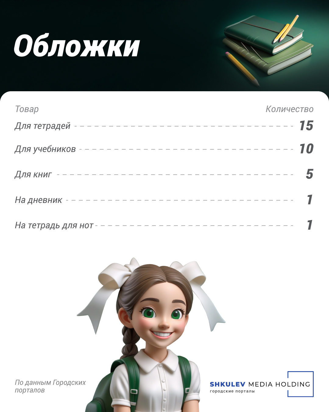 Раз набрали тетрадок, то к ним не помешает прикупить обложек. К счастью, их потребуется немного меньше: 15 — для тетрадей, 10 — для учебников, 1 — на дневник, 1 — для нотной тетради и 5 — для книг.