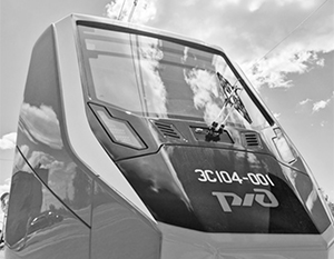 Поезд стоит на улице на путях для динамических испытаний. Окрашен в красно-черно-серые тона. На нем логотип РЖД и надпись «ЭС104-001». Цифры «001» означают первый поезд.