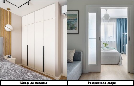 В маленьких квартирах есть смысл отказаться от классических распашных дверей – это позволит заполучить дополнительную площадь на ограниченном метраже. Даже если они минималистичные, в тон стен, без объемного короба, вы все равно должны оставить место для того, чтобы открывать и закрывать их. А ведь порой именно этих злосчастных десяти сантиметров не хватает для того, чтобы установить кровать или шкаф желаемого размера.