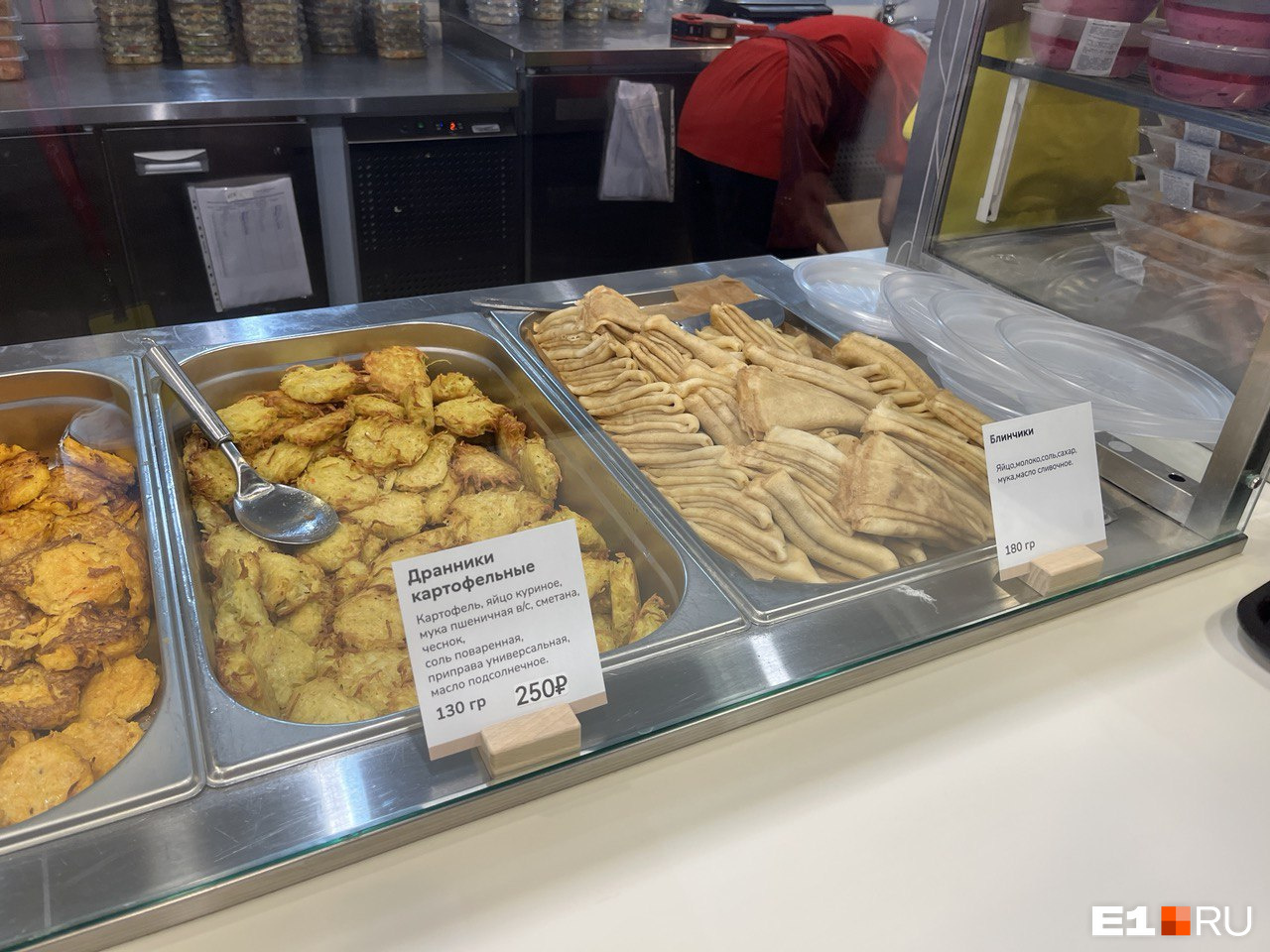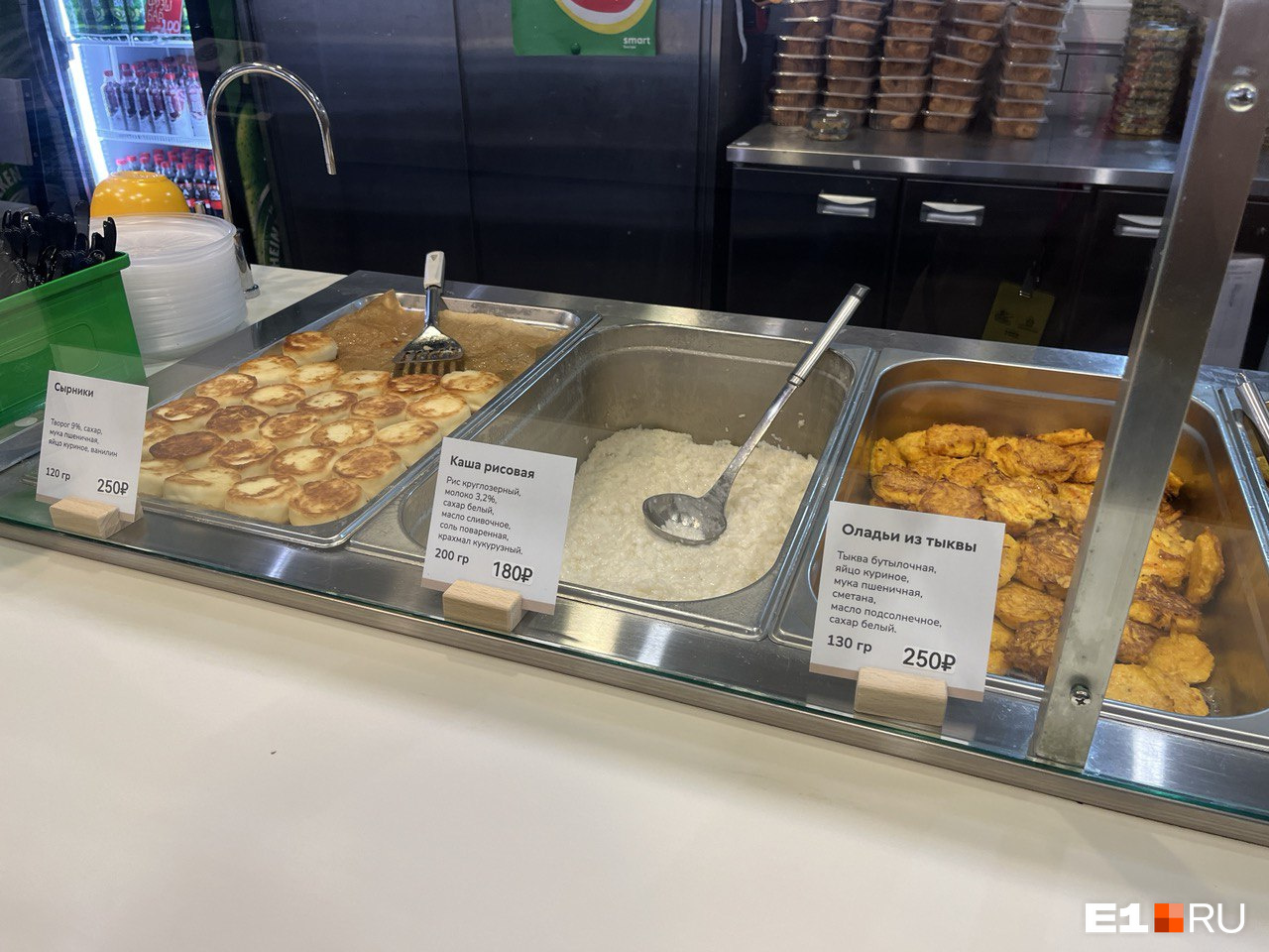 Рядом работает раздача с полезной (и не очень) едой. Здесь всё как в стандартной столовой: котлеты, гарниры, компоты. Вот только цены выше в 2–3 раза. Блинчики стоят 180 рублей, драники — 250 рублей. Рисовая каша на завтрак обойдется в 180 рублей за порцию. А пара сырников будет стоить 250 рублей.