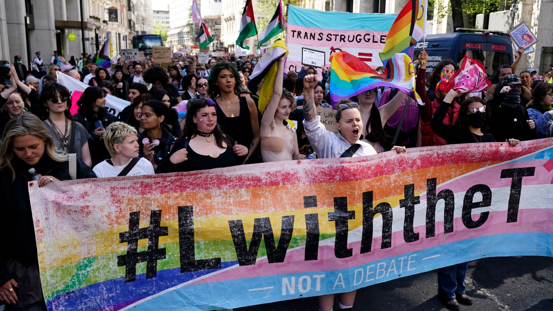 Thousands of trans rights activists have been demonstrating in central London days after the Supreme Court ruled the legal definition of a woman is based on biological sex.