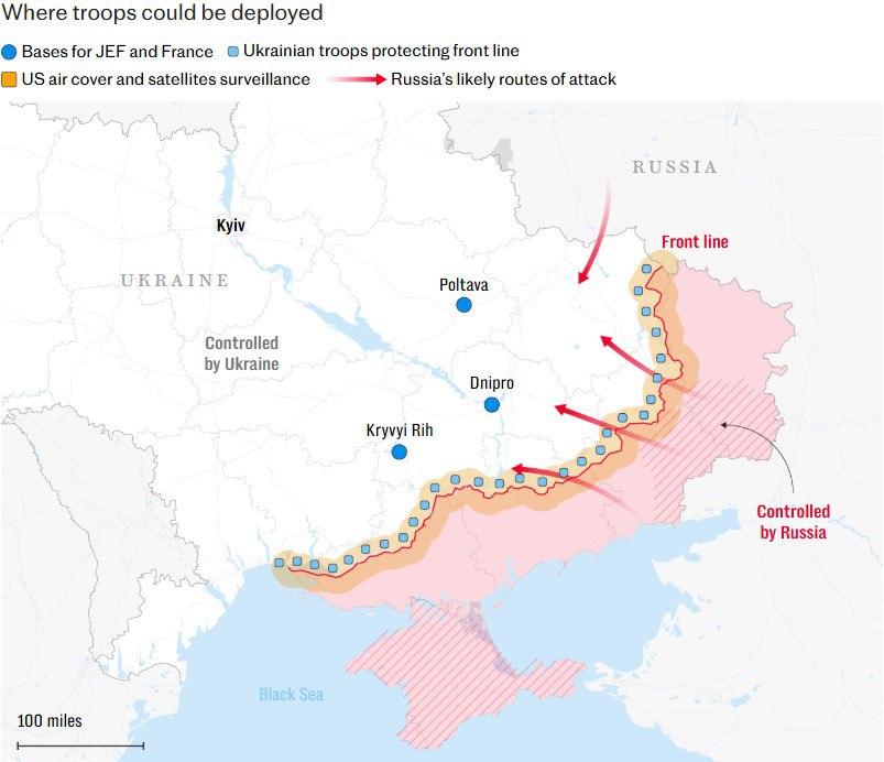 Согласно англо-французскому плану, менее 30 000 военнослужащих под руководством европейцев будут размещены в украинских городах, портах и других критически важных объектах инфраструктуры, таких как атомные электростанции, вдали от нынешних линий фронта.