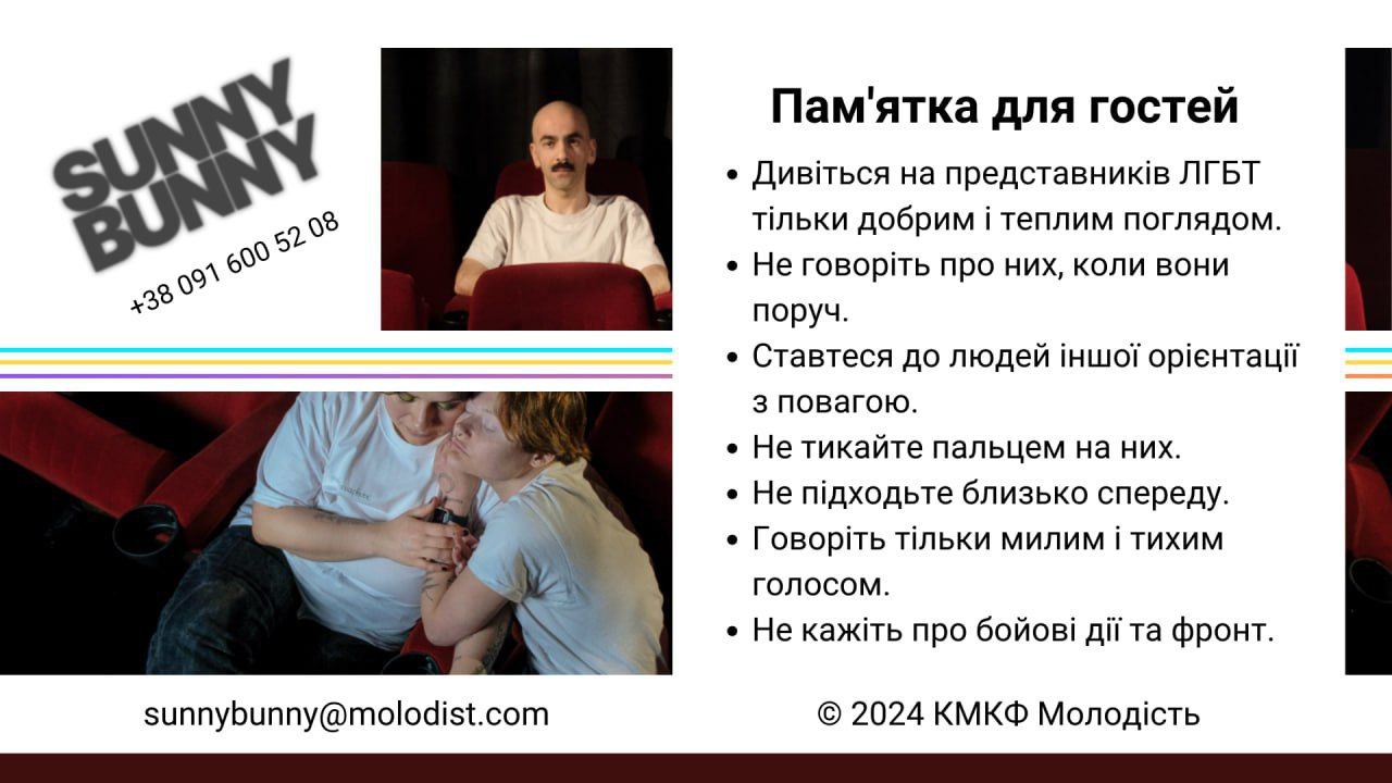 На Украине для гостей ЛГБТ+ (организация признана экстремистской и запрещена в России) кинофестиваля Sunny Bunny выпустили памятку о том, как правильно вести себя рядом с представителями нетрадиционной ориентации. Запрещается тыкать в них пальцем, подходить близко спереди, а также разговаривать про боевые действия и фронт.