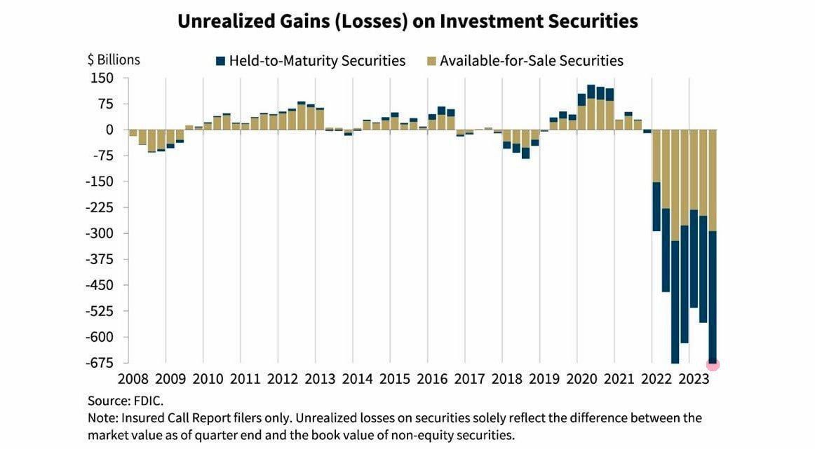 Совокупный нереализованный убыток банков США в ценных бумагах опять находится не рекордном уровне.