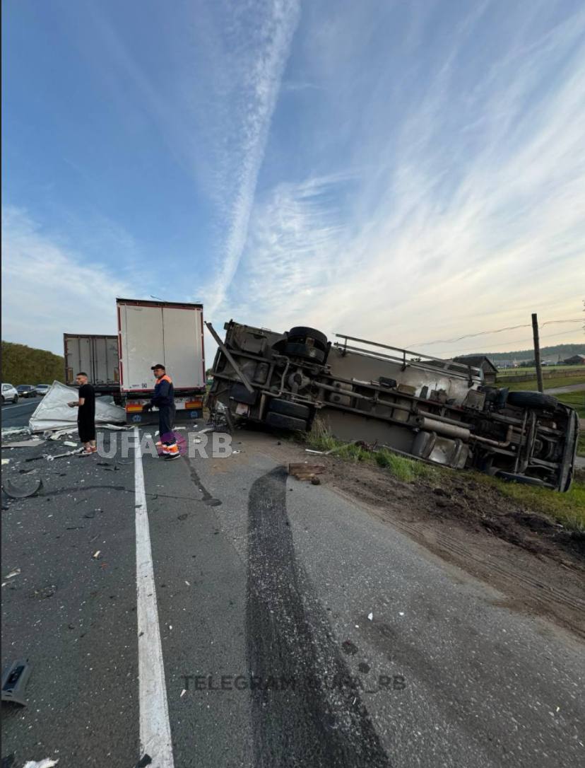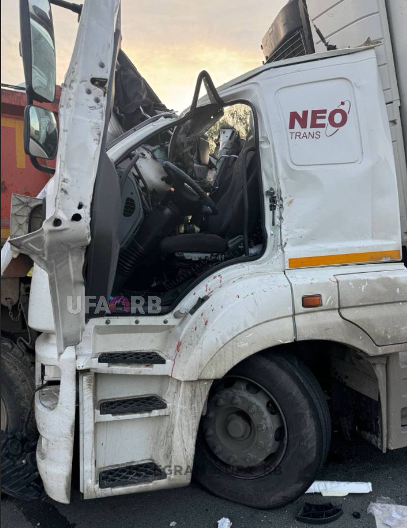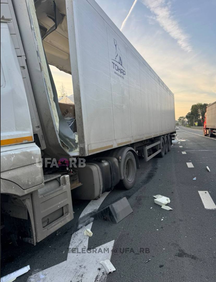 Водитель фуры уснул и снес 2 фуры стоящие на обочине. У него открытая рана головы, скорая забрала, все живы
