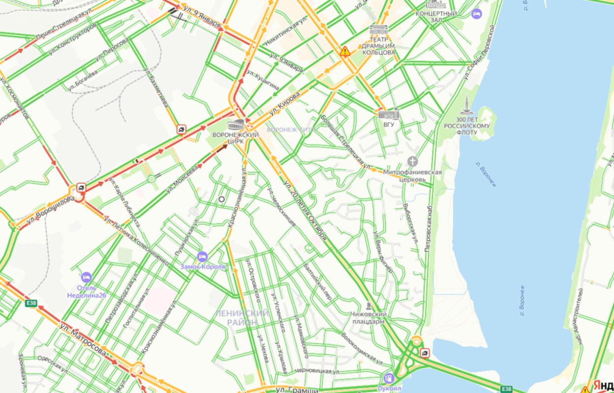 Пробка длиной в 2,2 километра сковала движение на улице Ворошилова в Воронеже, если верить данным сервиса Яндекс карты.