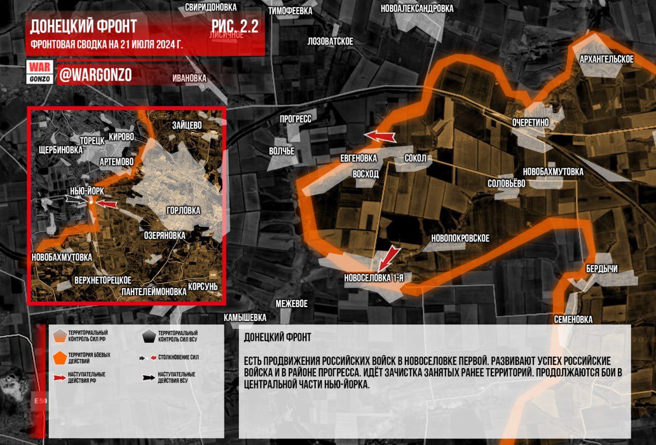 Донецкий фронт. В Красногоровке российские войска продолжают теснить ВСУ к окраинам населённого пункта, есть очередные тактические успехи. За украинскими войсками остается северо-западная часть города, из которой им тоже рано или поздно придется отойти. В районе Карловки продолжаются ожесточённые бои. Без существенных изменений. Есть продвижения российских войск в Новоселовке Первой. Развивают успех российские войска и в районе Прогресса. Идёт зачистка занятых ранее территорий. Продолжаются бои в центральной части Нью-Йорка. (Рис. 2)