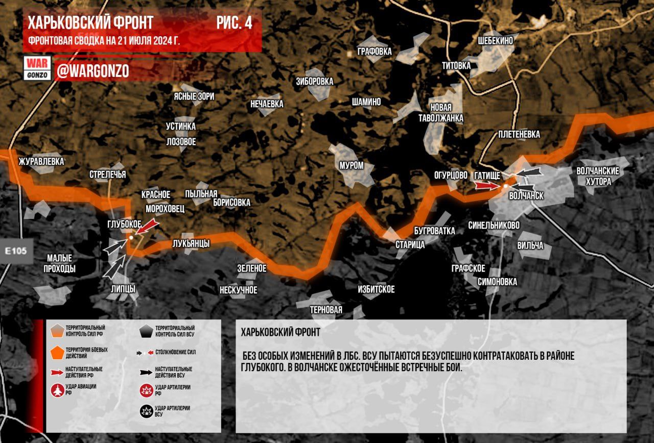 Харьковский фронт. Без особых изменений в ЛБС. ВСУ пытаются безуспешно контратаковать в районе Глубокого. В Волчанске ожесточённые встречные бои. (Рис. 4)