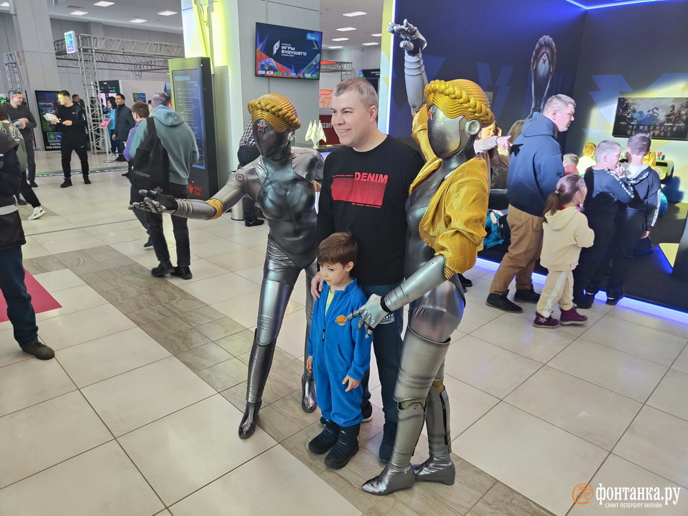 Рядом выстроилась очередь к двум робо-близняшки из игры Atomic Heart. Цельнометаллические девушки настолько эффектно выглядят, что с ними хотят сфотографироваться даже те, кто ничего не слышали о главном успехе отечественного геймедева последнего десятилетия.