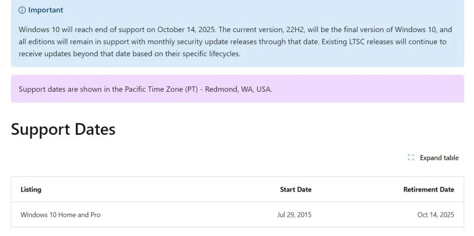 Microsoft объявила о том, что поддержка операционной системы Windows 10 завершится с 14 октября 2025 года
