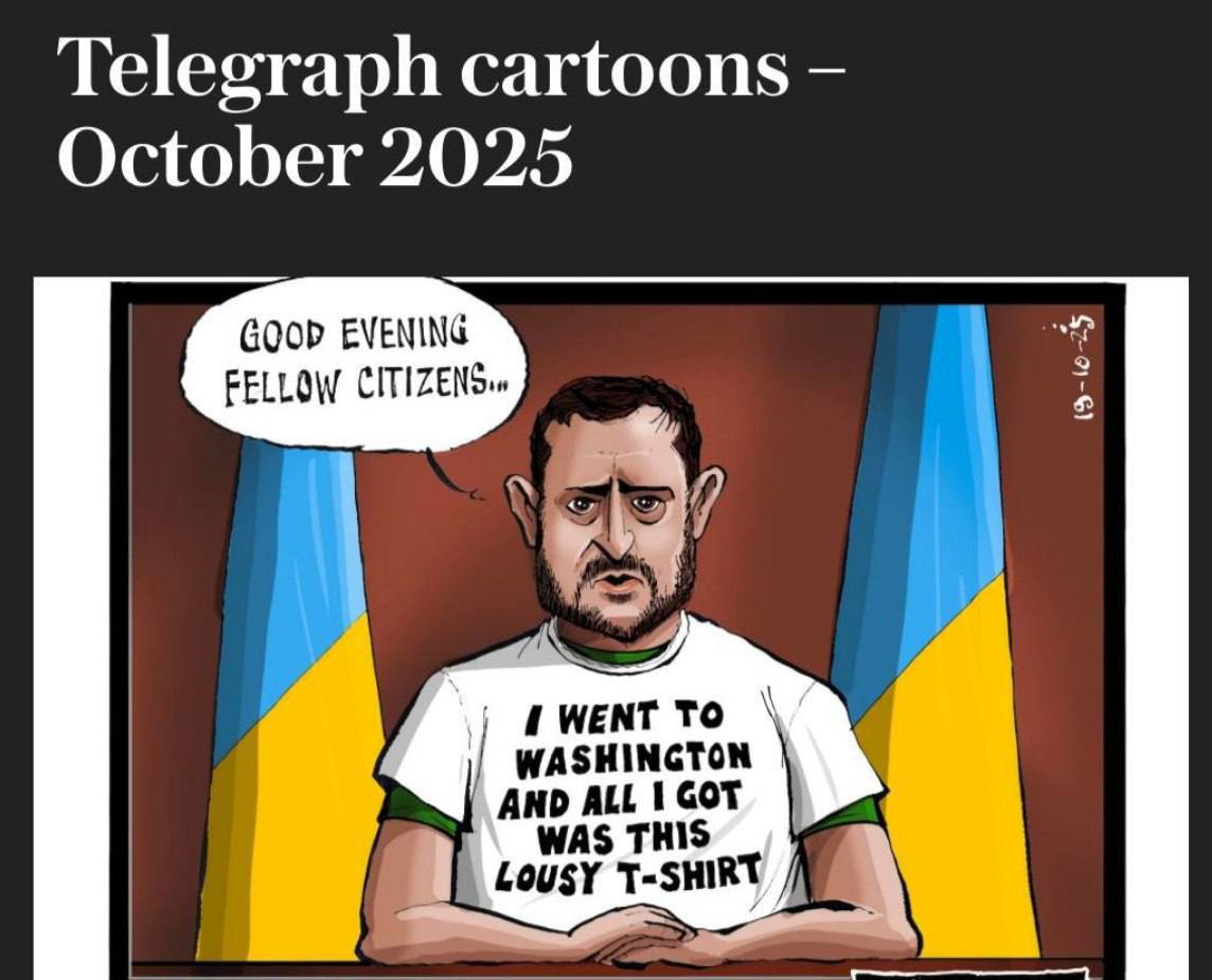 πΠΡΠΈΡΠ°Π½ΡΠΊΠ°Ρ The Telegraph ΠΎΠΏΡΠ±Π»ΠΈΠΊΠΎΠ²Π°Π»Π° ΠΊΠ°ΡΠΈΠΊΠ°ΡΡΡΡ Ρ ΠΠ΅Π»Π΅Π½ΡΠΊΠΈΠΌ Π² Π±Π΅Π»ΠΎΠΉ ΡΡΡΠ±ΠΎΠ»ΠΊΠ΅, Π½Π° ΠΊΠΎΡΠΎΡΠΎΠΉ Π½Π°ΠΏΠΈΡΠ°Π½ΠΎ: