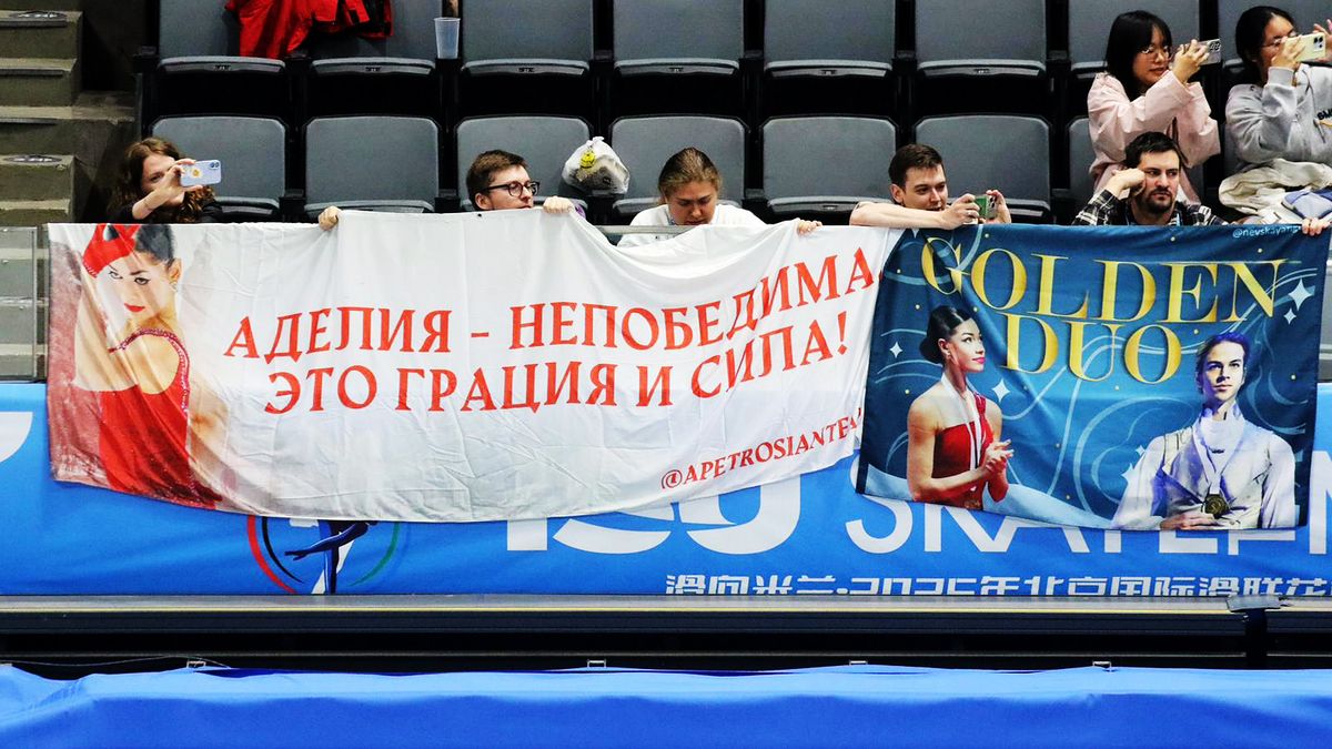 Жарко было не только на льду. Во время разминки несколько фанатов развернули баннеры в поддержку Аделии, были плакаты и у российских журналистов, включая автора этой статьи — болельщики фигуристки передали из Москвы.