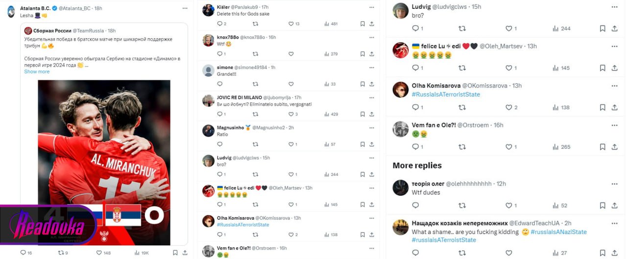Украинские псевдокомментаторы атаковали пост итальянского ФК «Аталанта» в социальной сети «Х» (бывший Twitter). Боты массово оскорбляют клуб и выступающего за него Алексея Миранчука, который накануне забил гол в матче Россия — Сербия. Своим постом «Аталанта» отметил техничность гола Алексея в игре, результатом которая стала уверенная победа сборной России.