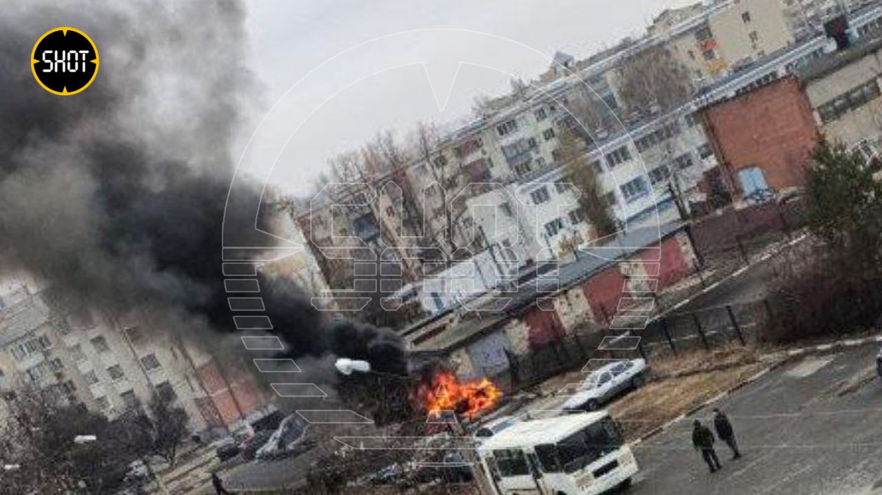 На видео — частный сектор Разумного после прилётов. На фото — парковка того же посёлка, там сгорело около шести машин.