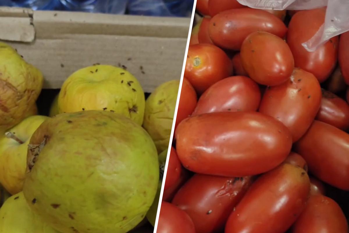 — С порога покупателей встречает неприятный запах гнилых фруктов, который пронизывает весь магазин. В продаже яблоки и помидоры, которые практически полностью сгнили в коробках. Особенно шокирует количество мелких мушек, которые слоем покрыли некоторые яблоки. Взлетая, при каждом движении покупателей, они разлетались по всему магазину. На видео супруги мушки уже частично разлетелись из-за близкой съемки, — вживую их гораздо больше, — написал посетитель магазина в ведомство.