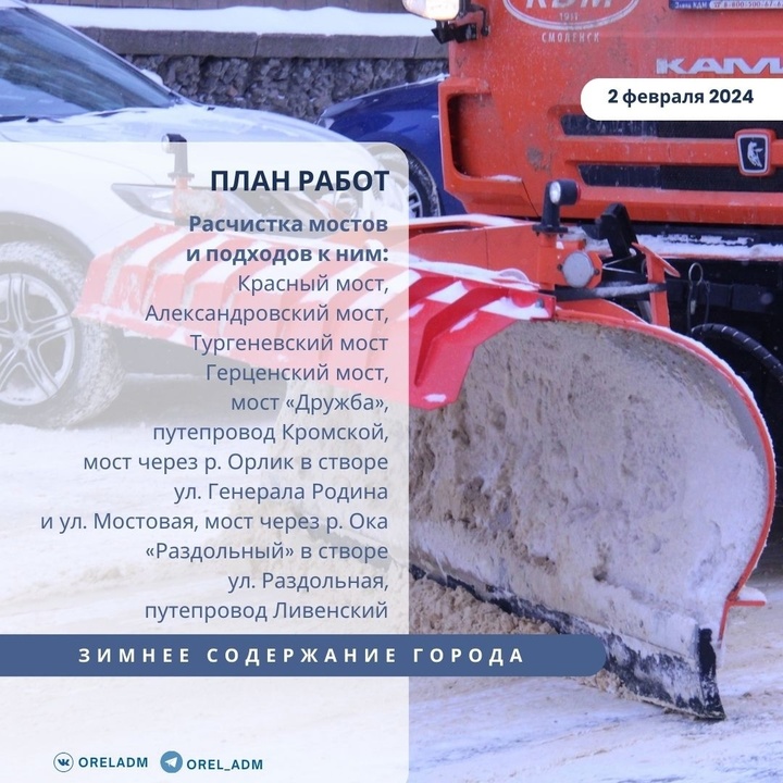 Сегодня в городе планируют расчищать мосты и подходы к ним и тротуары. Также будут осуществлять вывоз снега. Подробнее о плане работ на сегодняшний день – в карточках, которые публикует пресс-служба мэрии.