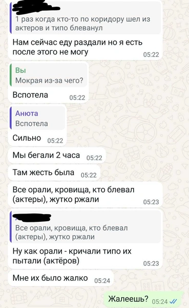 — Я два раза ревела и четыре раза чуть не блеванула. Одна девочка так испугалась, что потерялась, — писала школьница маме. — Там жесть была. Все орали, кровища, кто-то блевал (актеры), жутко ржали. Ну как орали — кричали, будто их пытали. Мне было жалко актеров.