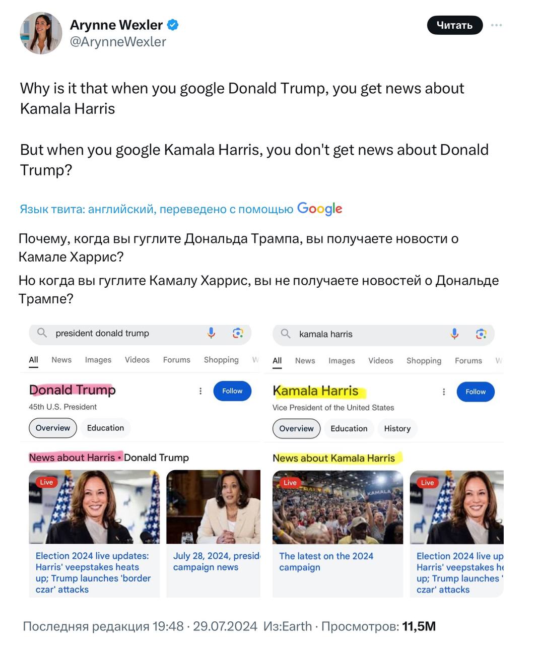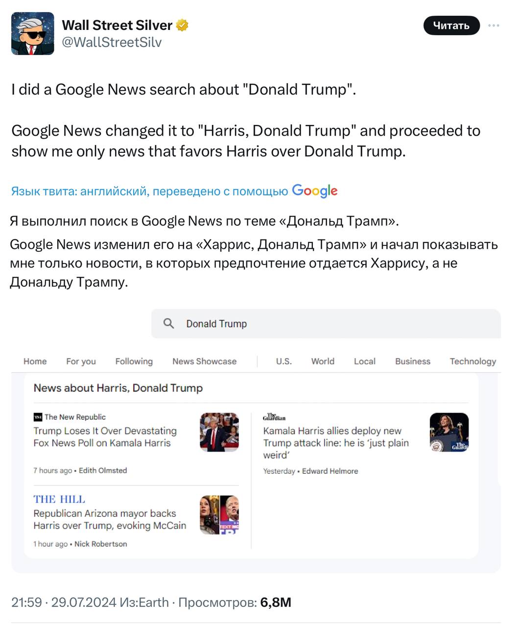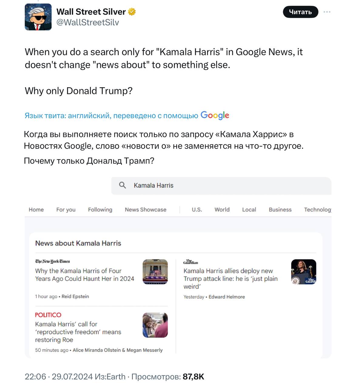 Но Гугл пошел и дальше: если пользователь все жё, несмотря на отсутствие Трампа в поиске, загуглит «Президент Трамп» то поисковик выдаст ему новости, в которых рассказывают, что Харис (главный оппонент Трампа на предстоящих выборах) намного лучше Трампа.