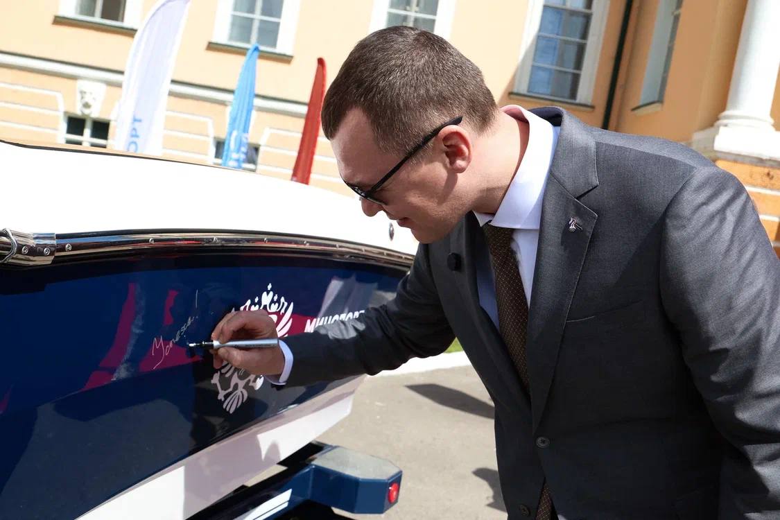 Сегодня ребята стали участниками торжественной церемонии в Министерстве спорта. Я передал ключи от катера-буксировщика для водных лыж. Новой профессиональной техники, а этот катер имеет специальные конструктивные особенности, у команды не было с 1989 года.