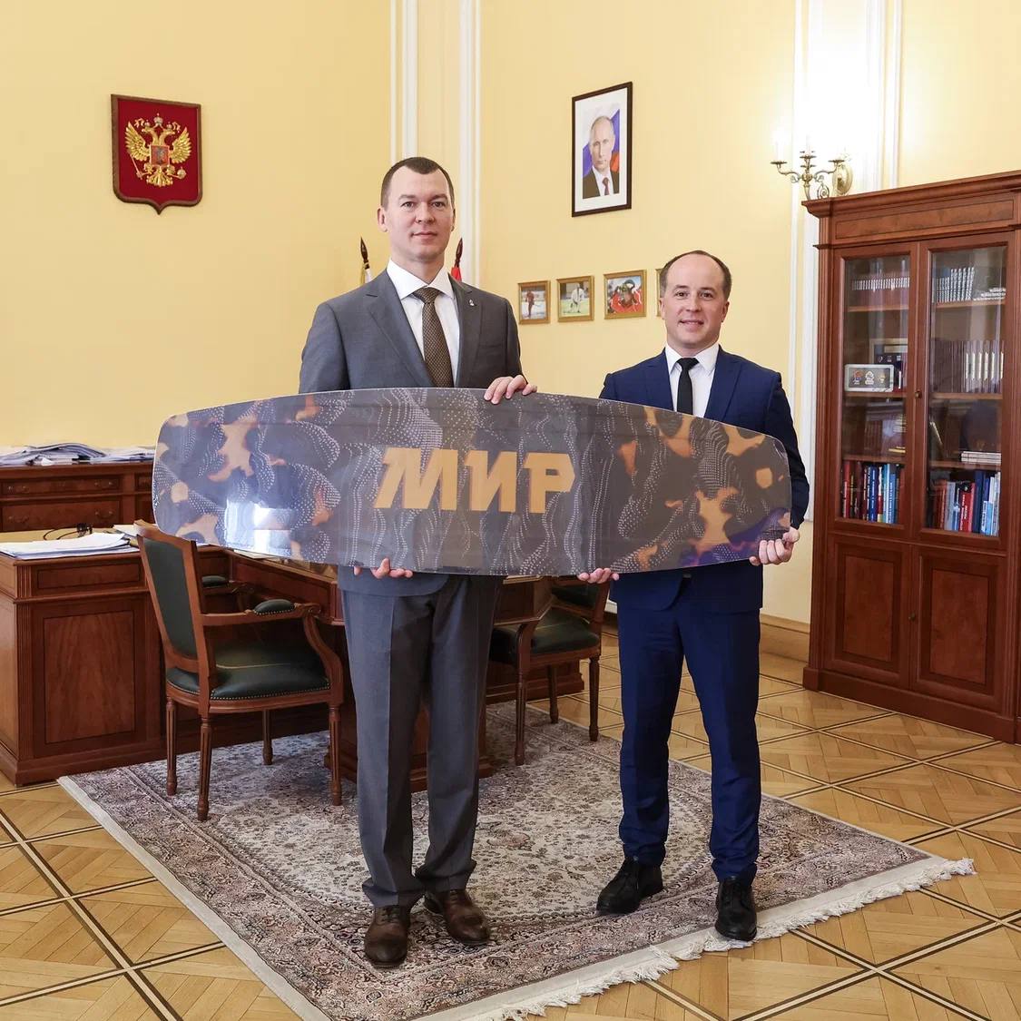 Уже на двусторонней встрече с президентом Федерации воднолыжного спорта России говорили о работе федерации, которая развивает 14 спортивных дисциплин. Затронули тему импортозамещения. Алексей Чернов презентовал вейкборд полностью российского производства под брендом «МИР». Это спортивное оборудование делают в Санкт-Петербурге из отечественных материалов. Начался также выпуск российских гидрокостюмов для наших атлетов.