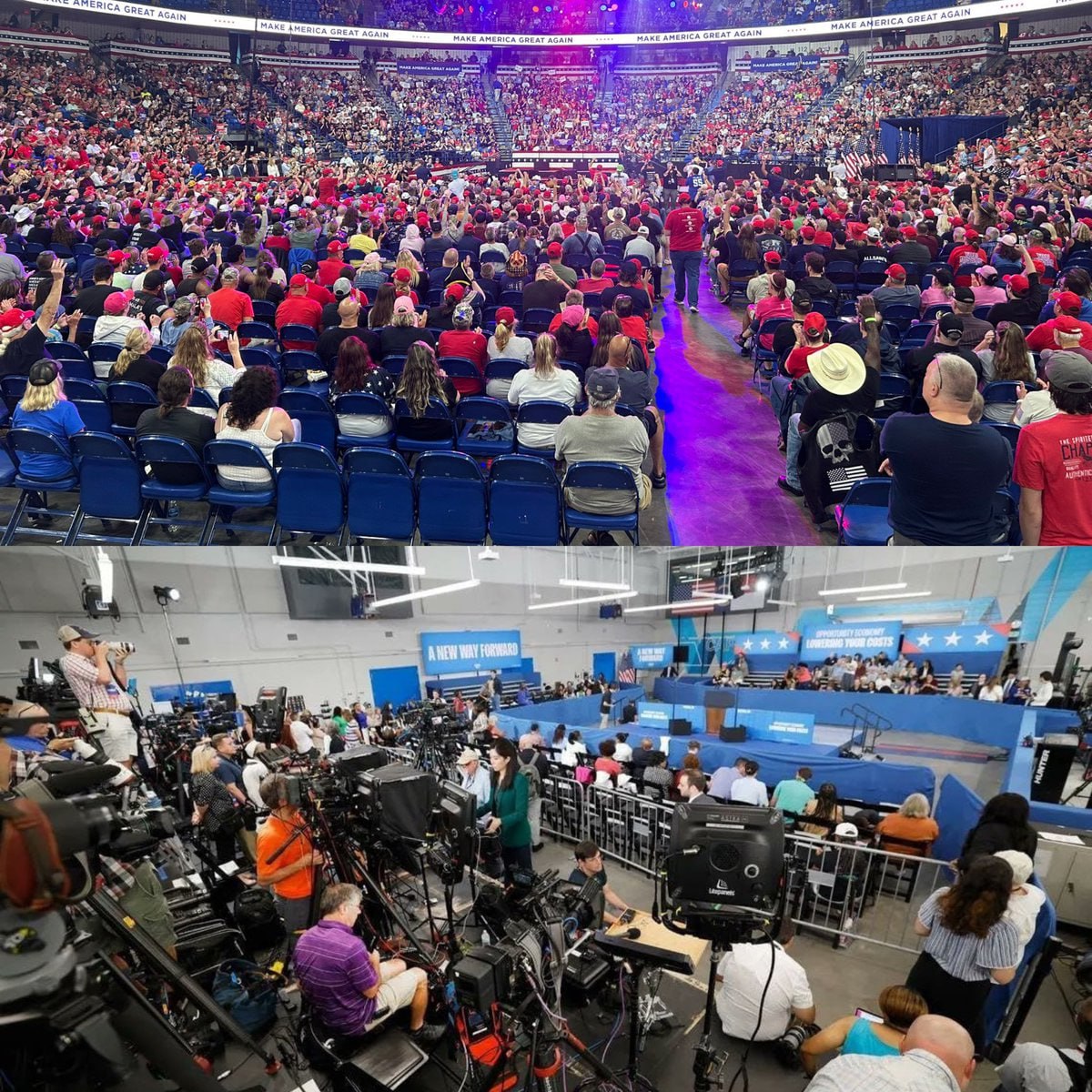 Несмотря на то, что население города Роли, где выступала вице-президент США, в 11 раз больше населения Уилкс-Барра, куда приехал Трамп, ему удалось собрать стадион, хотя навстречу с Харрис пришли всего 109 человек.
