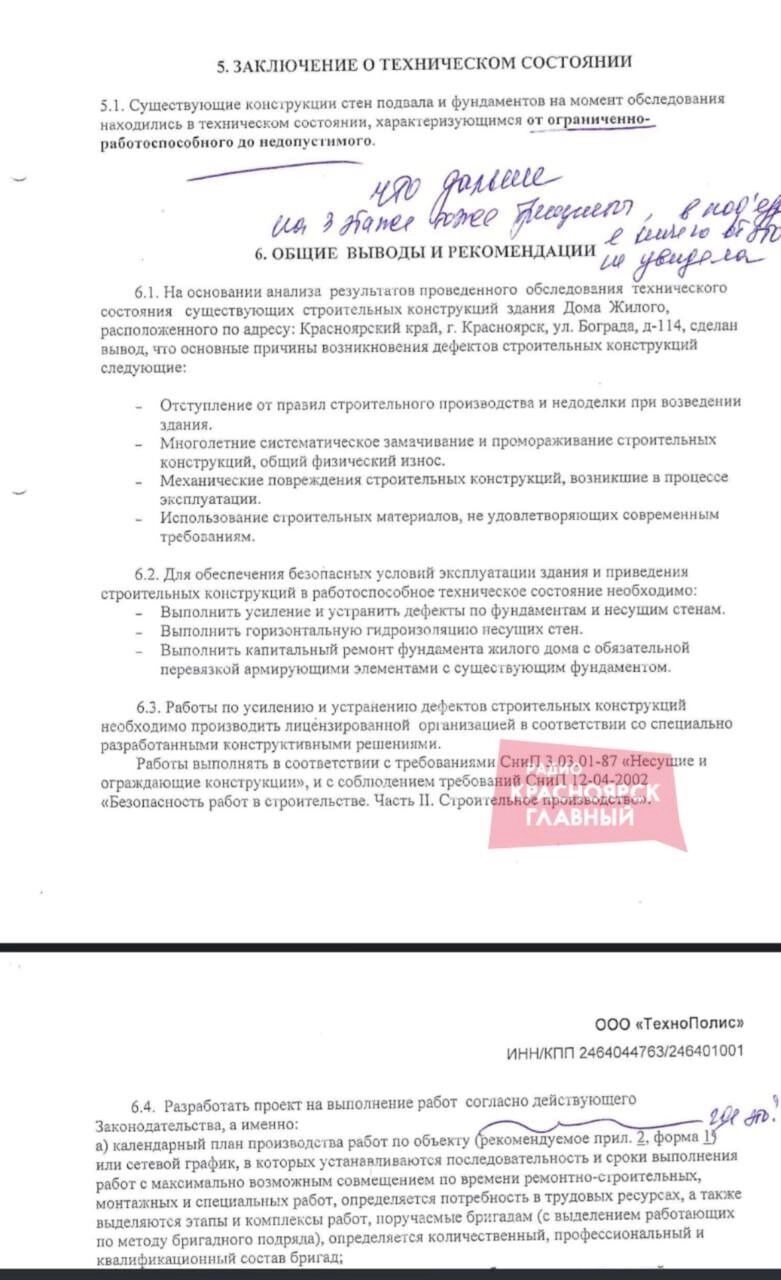 В 2019 году было заказано обследование дома, которое, судя по опубликованному документу, показало, что конструкции стен подвала и фундамента находились «в ограниченно-работоспособном до недопустимого состояния». В качестве причин указаны нарушения правил при строительстве, использование неподходящих материалов, износ и так далее.
