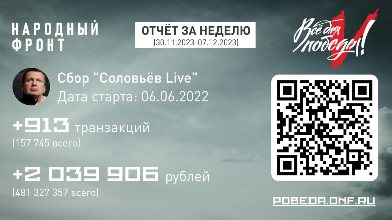 СоловьёвLIVE совместно с Народным фронтом ведет постоянный сбор. Каждый рубль важен!
