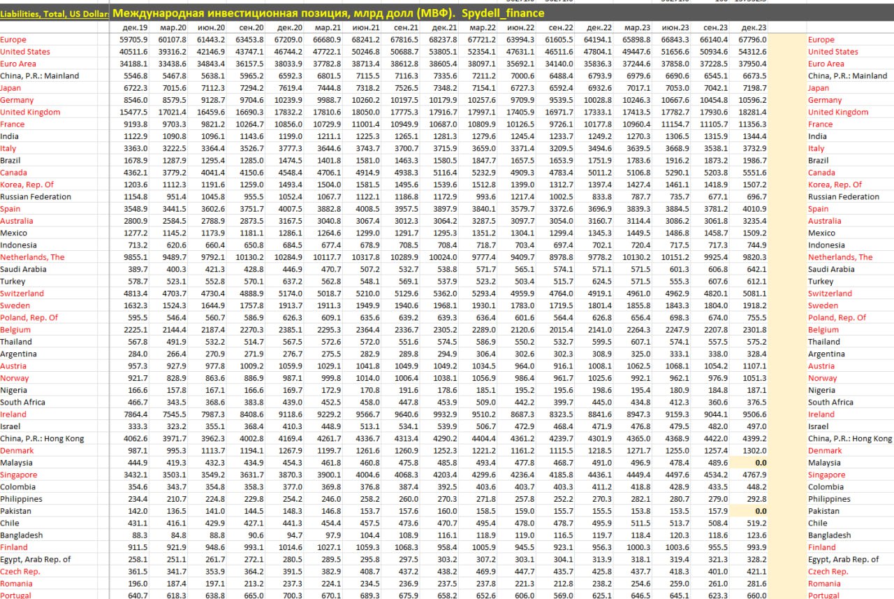 В таблице отображены внешние обязательства крупнейших стран мира (красным выделены недружественные к России страны).