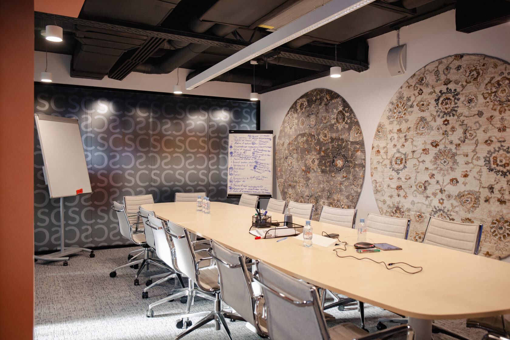 Герои смогли заглянуть в переговорные, каждую из которых назвали в честь географических локаций Татарстана. Здесь сотрудники проводят планёрки, ставят цели на год, а в свободное от работы время слушают обучающие лекции или участвуют в мастер-классах, например по рисованию или изготовлению свечей.