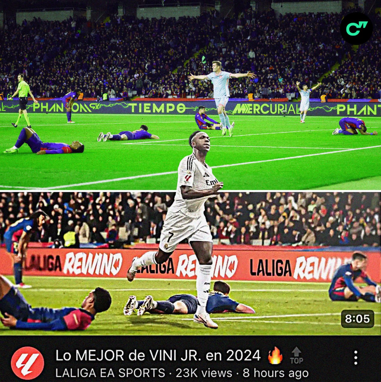 😲🎞 Официальный аккаунт Ла Лиги на ютубе взял фото с празднования гола Серлота в ворота «Барсы» и поместил вместо него Винисиуса: получившееся изображение они использовали как обложку для видео с лучшими голами бразильца в 2024-м
