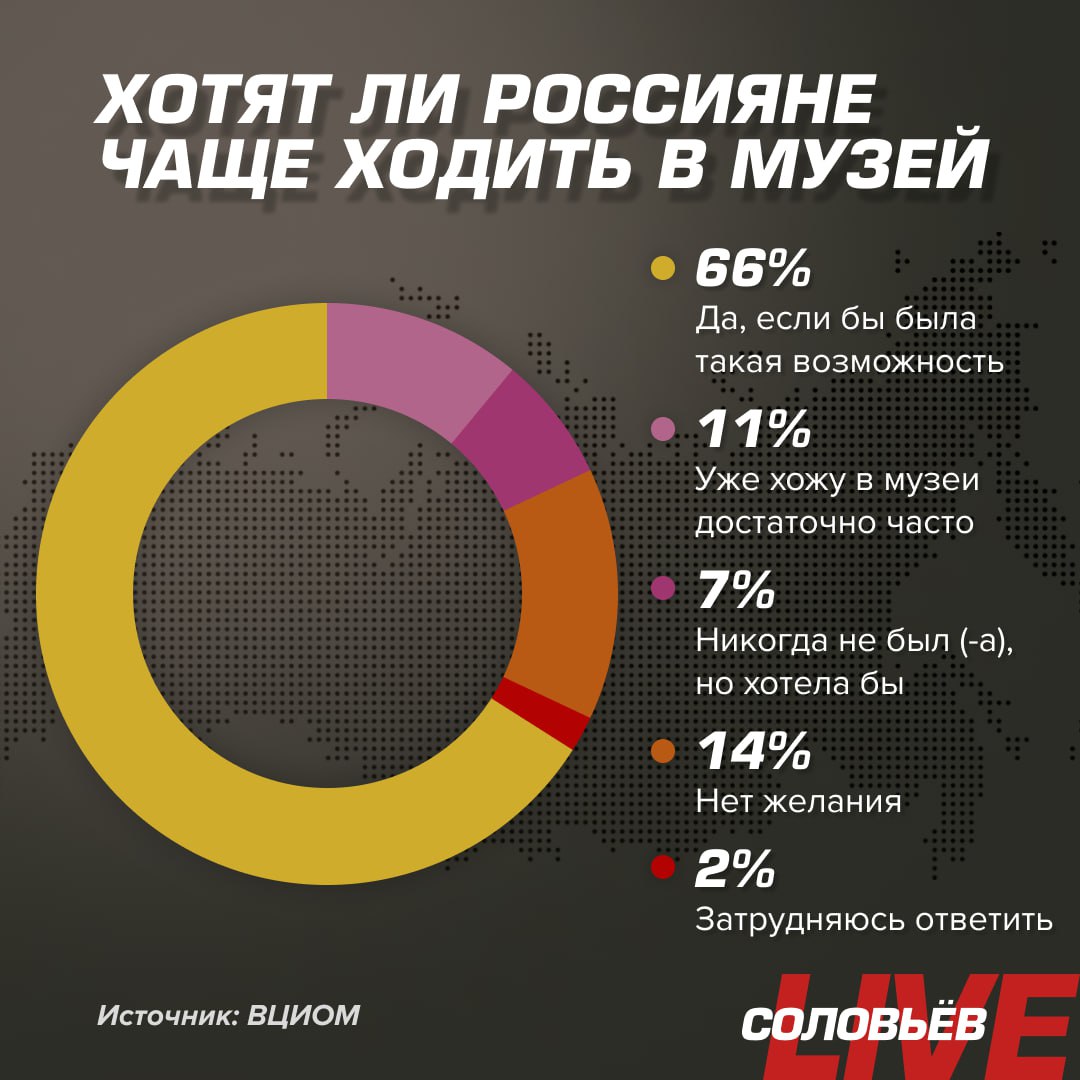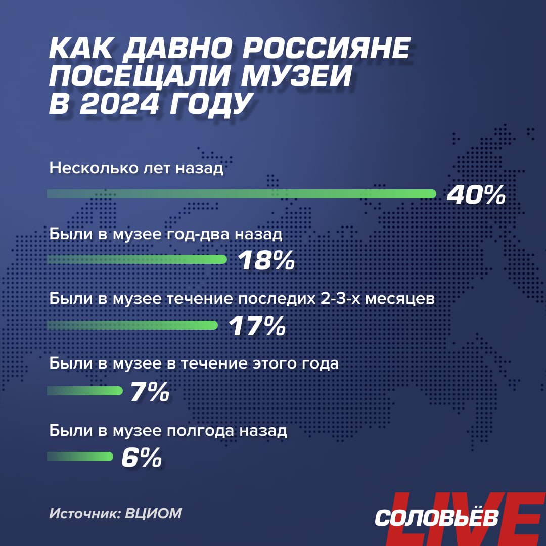 Опрос ВЦИОМ: Почти каждый второй россиянин посещал музеи в последние пару лет (48%).