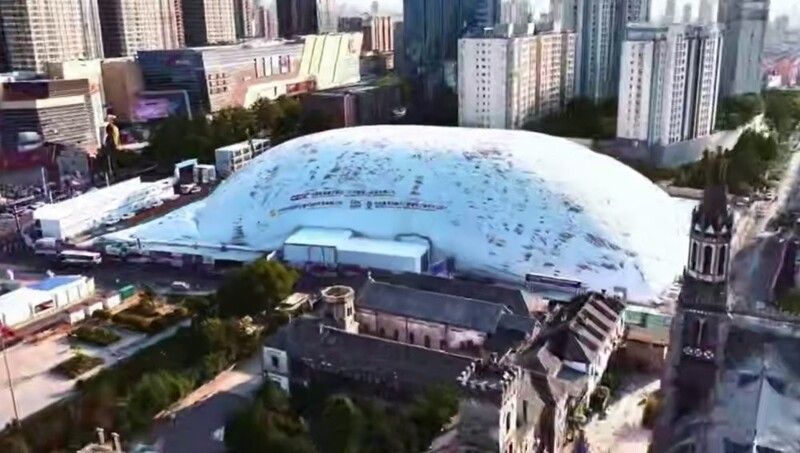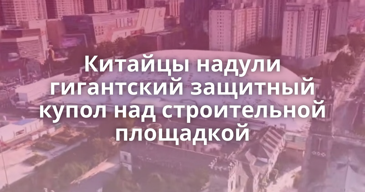 На стройке в китайском Цзинане надули гигантский защитный купол, чтобы по округе не разлеталась пыль и не тревожить местных шумом. Оболочка высотой 50 м покрывает площадь около 20 000 м². Она изготовлена из эластичного и огнестойкого поливинилиденфторида, который заглушает звуки на 80%, а внутри установлены мощные вентиляторы с системой увлажнения, обеспечивающие циркуляцию свежего воздуха для рабочих.