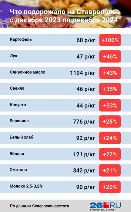 Мы продолжаем подводить итоги 2024 года на Ставрополье. На этот раз обратимся к ценам на продукты. Редакция 26.RU подсчитала, какие товары подорожали больше всего с декабря 2023 по декабрь 2024 года. Данные взяли у Северокавказстата.