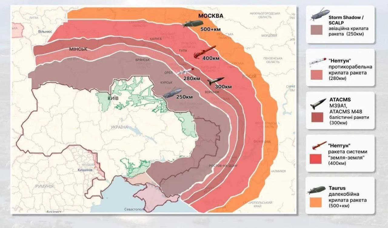 Дальность потенциального поражения западных вооружений после отмены запрета на дальнобойносте передаваемых ракет.