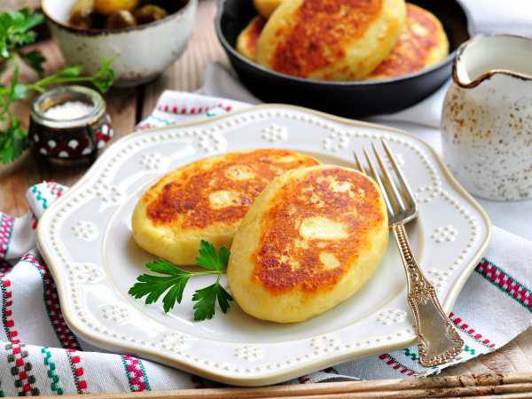 8. Присыпать разделочную доску мукой, сформировать из картофельного пюре лепешки, выложить их на доску. В середину каждой лепешки выложить столовую ложку с горкой тушеной капусты, защипнуть края, придав им форму котлет. Из этого количества продуктов получается 8 крупных картофельных зраз.