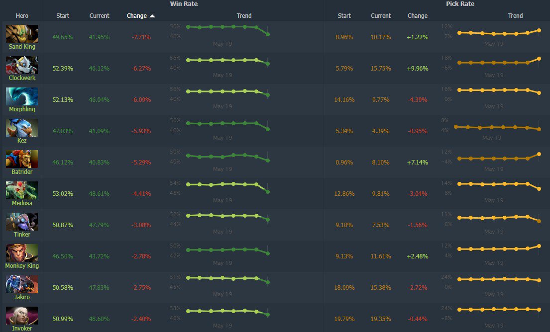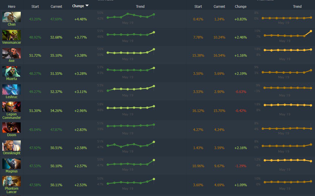 Chen (+4,48), Venomancer (+3,77), Axe (+3,38), Muerta (+3,28) и Leshrac (+3,11) стали лидерами по приросту винрейта среди всех персонажей.