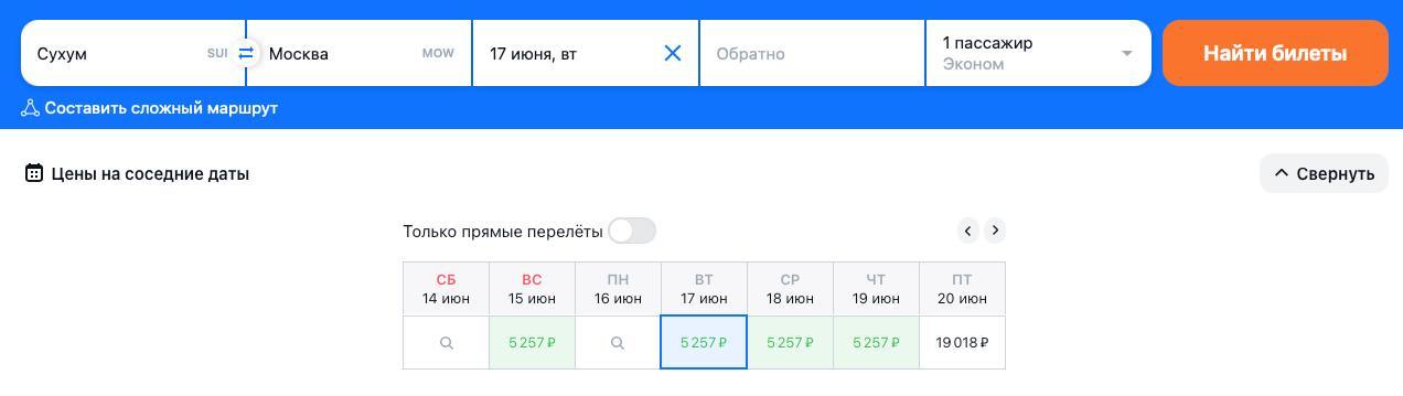 🇷🇺⚡️ Билеты на чартеры iFly из Сухума в Москву появились в продаже по 5250 ₽, их можно купить на агрегаторах. Билетов из Москвы в открытой продаже пока нет.