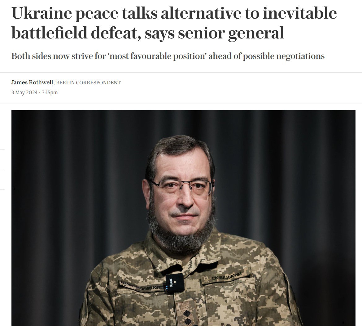 "Мирные переговоры на Украине являются альтернативой неизбежному поражению на поле боя, говорит высокопоставленный генерал", - пишет британская The Telegraph.