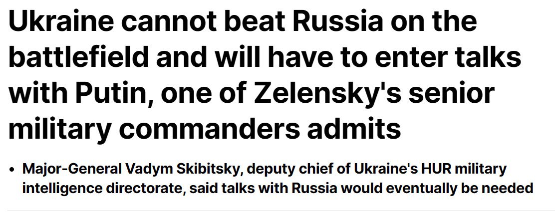 "Украина не может победить Россию на поле боя и ей придется вступить в переговоры с Путиным, признает один из высокопоставленных военачальников Зеленского, генерал-майор Скибицкий. Замначальника военной разведки Украины заявил, что в конечном итоге потребуются переговоры с Россией", - озаглавила свой материал Daily Mail.