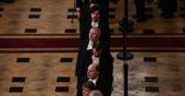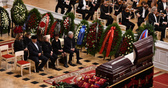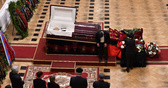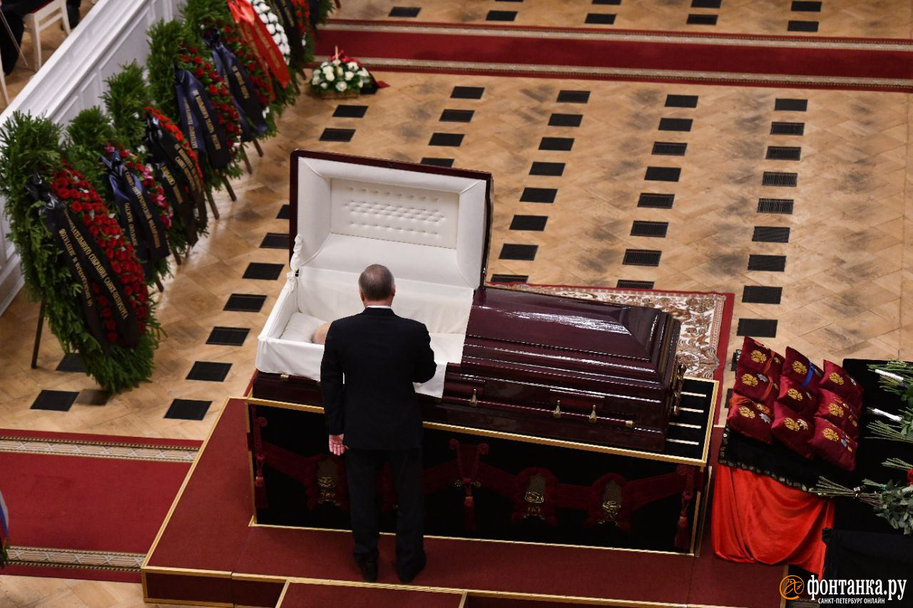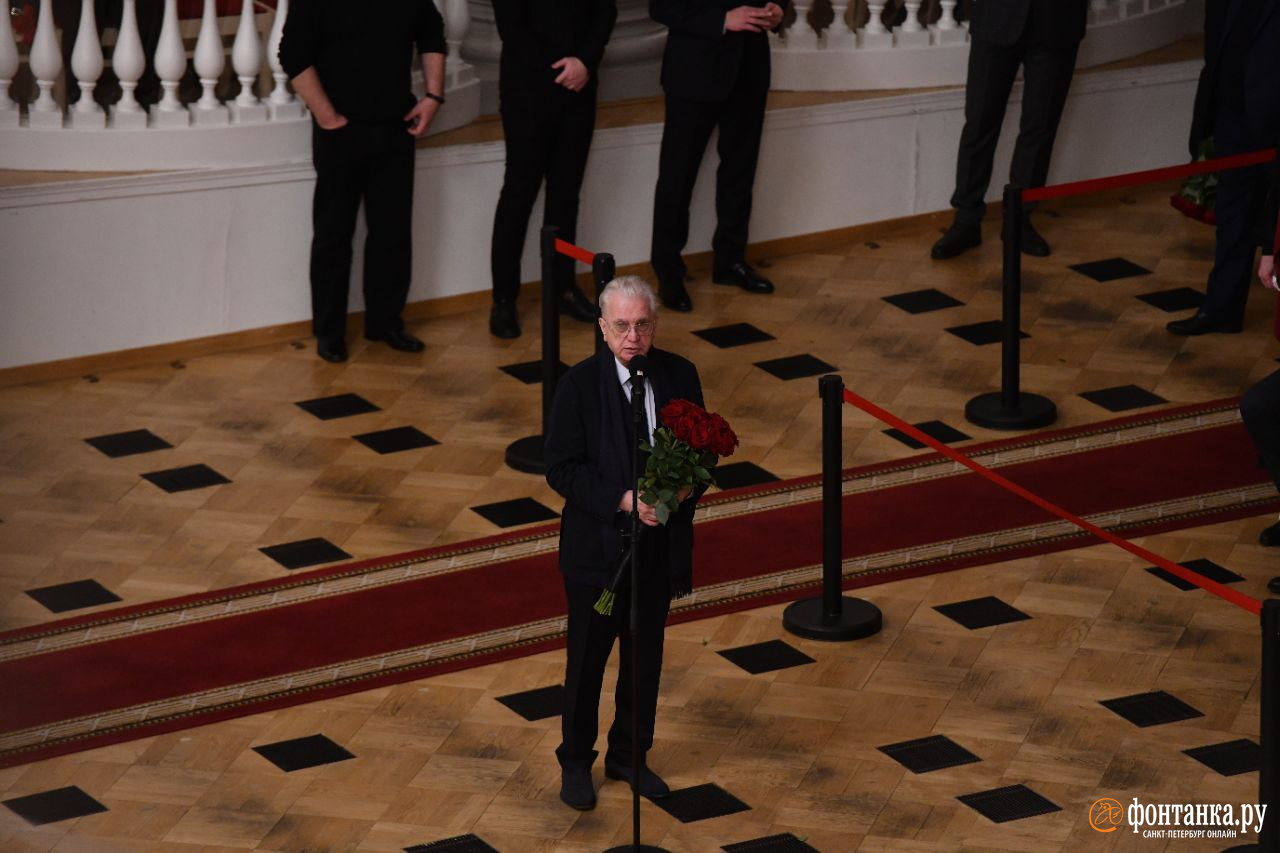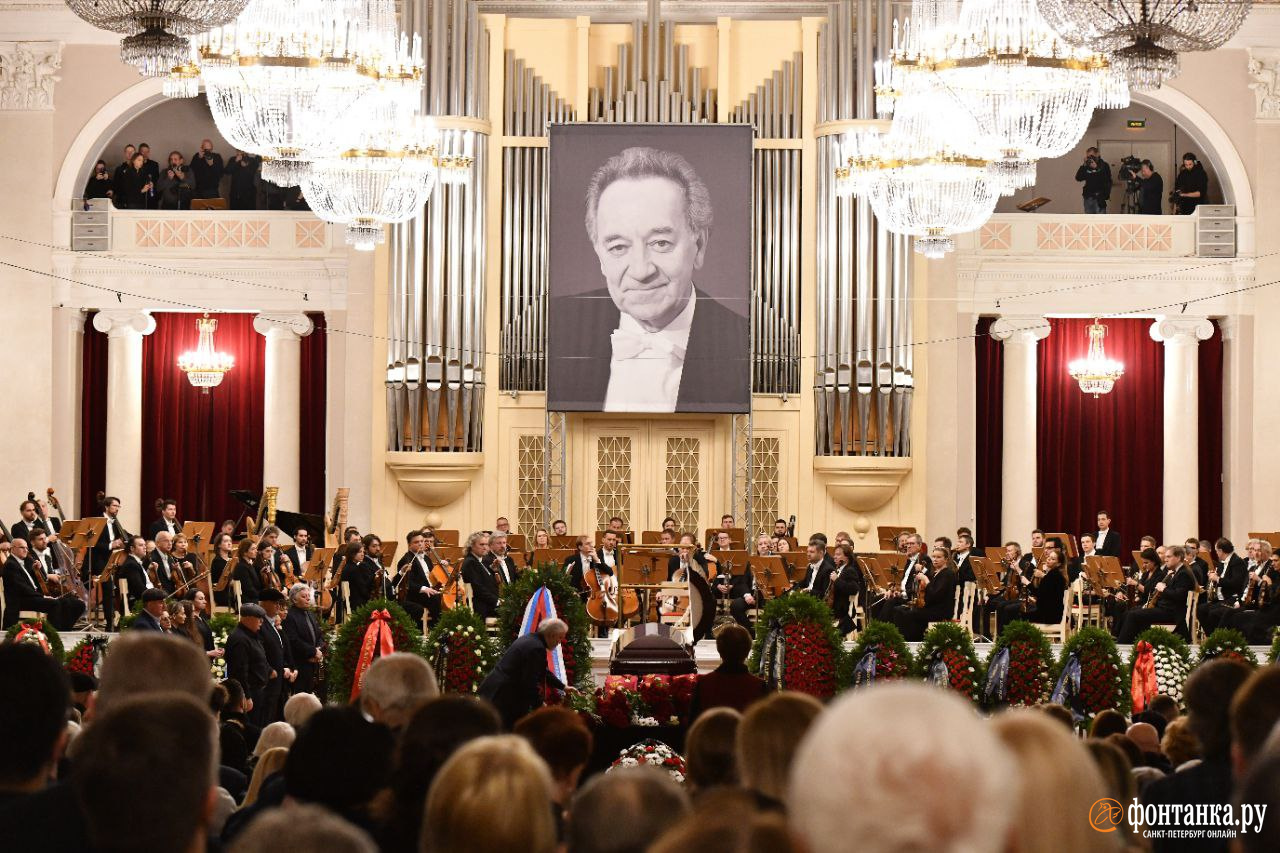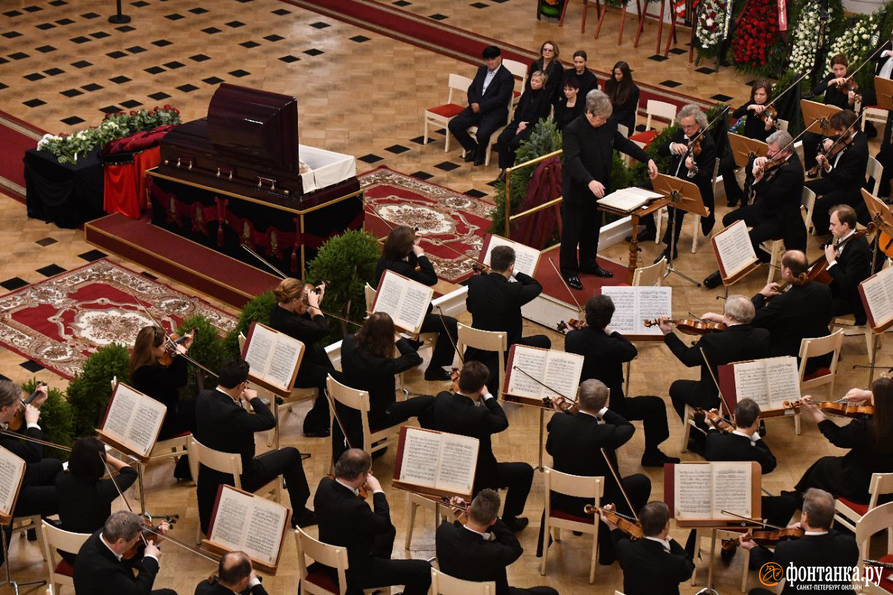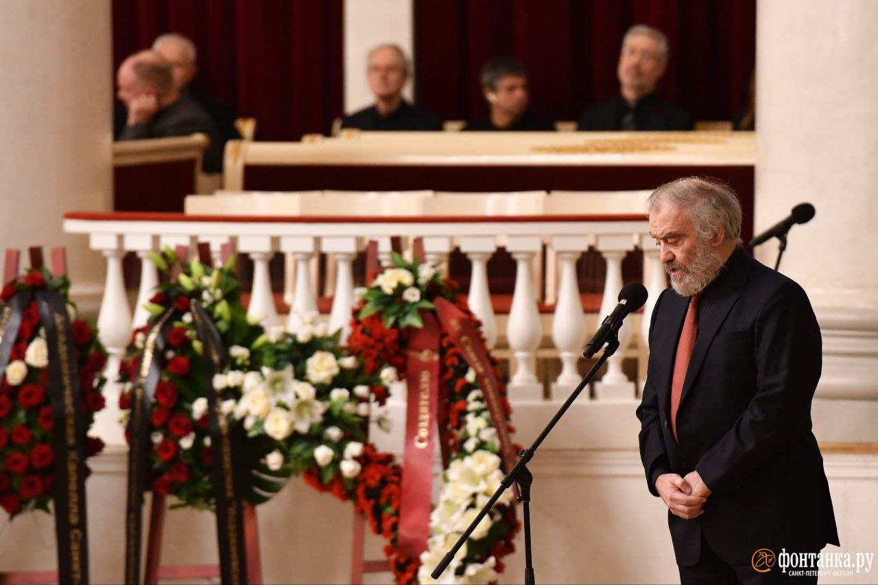 Первые прощающиеся начали приходить задолго до назначенного времени, еще до выхода на сцену оркестра под управлением Николая Алексеева. Первые ряды партера были убраны, уступив место пьедесталу с гробом и четырем десяткам траурных венков — от минкульта, различных творческих организаций и союзов, друзей и близких. Еще большее соцветие слов — телеграмм и писем — разместили сотрудники Филармонии на ее сайте. Там — соболезнования от президента Владимира Путина и премьера Михаила Мишустина, председателя Совфеда Валентины Матвиенко, глав Газпрома, ВТБ и Ростелекома, композитора Родиона Щедрина и дирижера Риккардо Мути, письма от Большого театра и БДТ — с подписями Алисы Фрейндлих, Олега Басилашвили и других звезд театра, что особо подчеркнул ведущий церемонии Николай Буров, зачитывая послания.