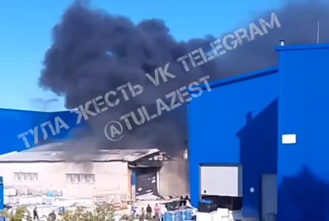 Предварительно, ЧП произошло на складе пластиковой тары. Из помещения идет едкий черный дым, видно пламя.