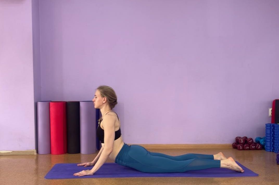 - На вдохе поднимите грудную клетку, прогибая спину, локти прижаты к телу.