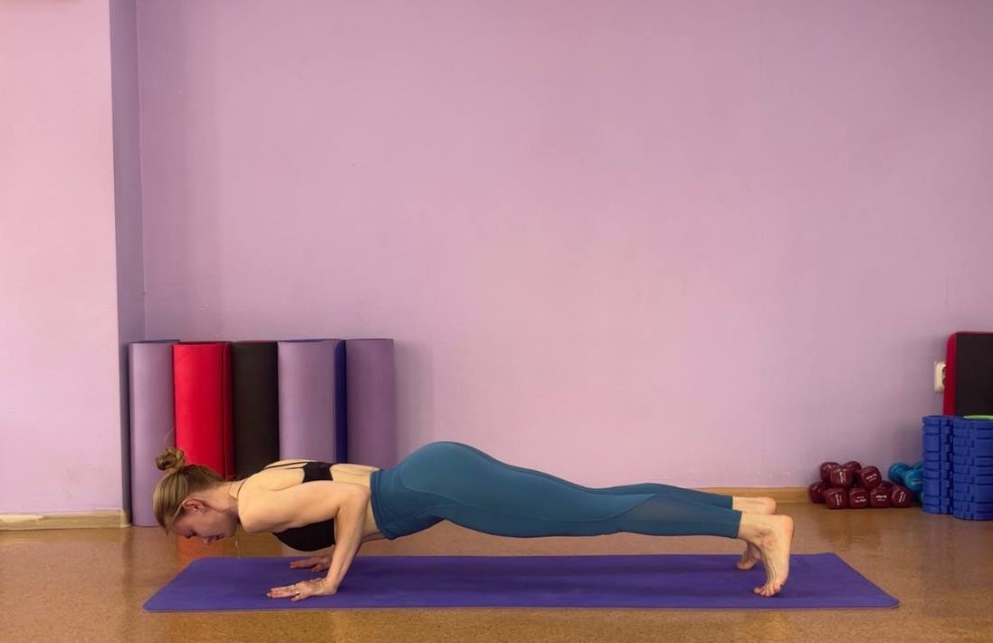 - Перенесите корпус вперёд до положения планки, при этом опустите таз вниз.