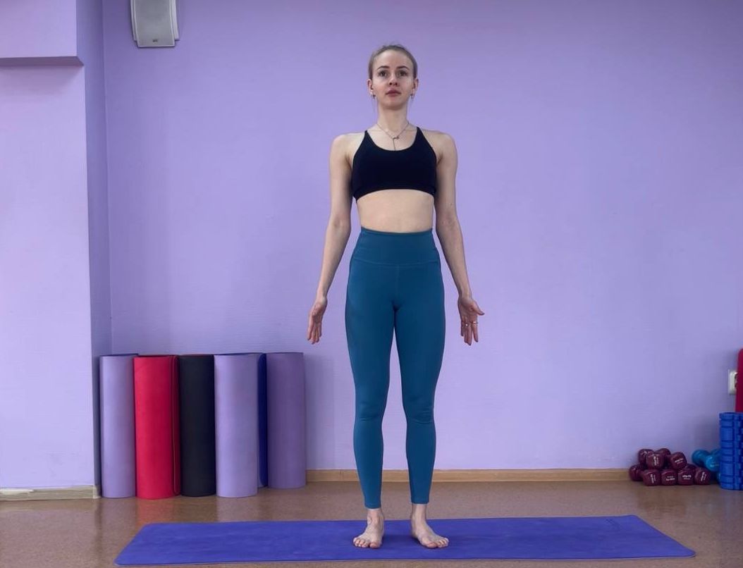 - Встаньте прямо, ноги расположите на ширине бёдер, стопы параллельны.